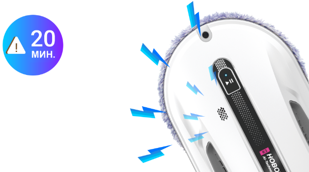 Встроенный ИБП (источник бесперебойного питания) предотвращает падение робота. В случае отключения электроэнергии, встроенный ИБП удерживает HOBOT на на окне в течение 20минут, издавая предупреждающий сигнал.